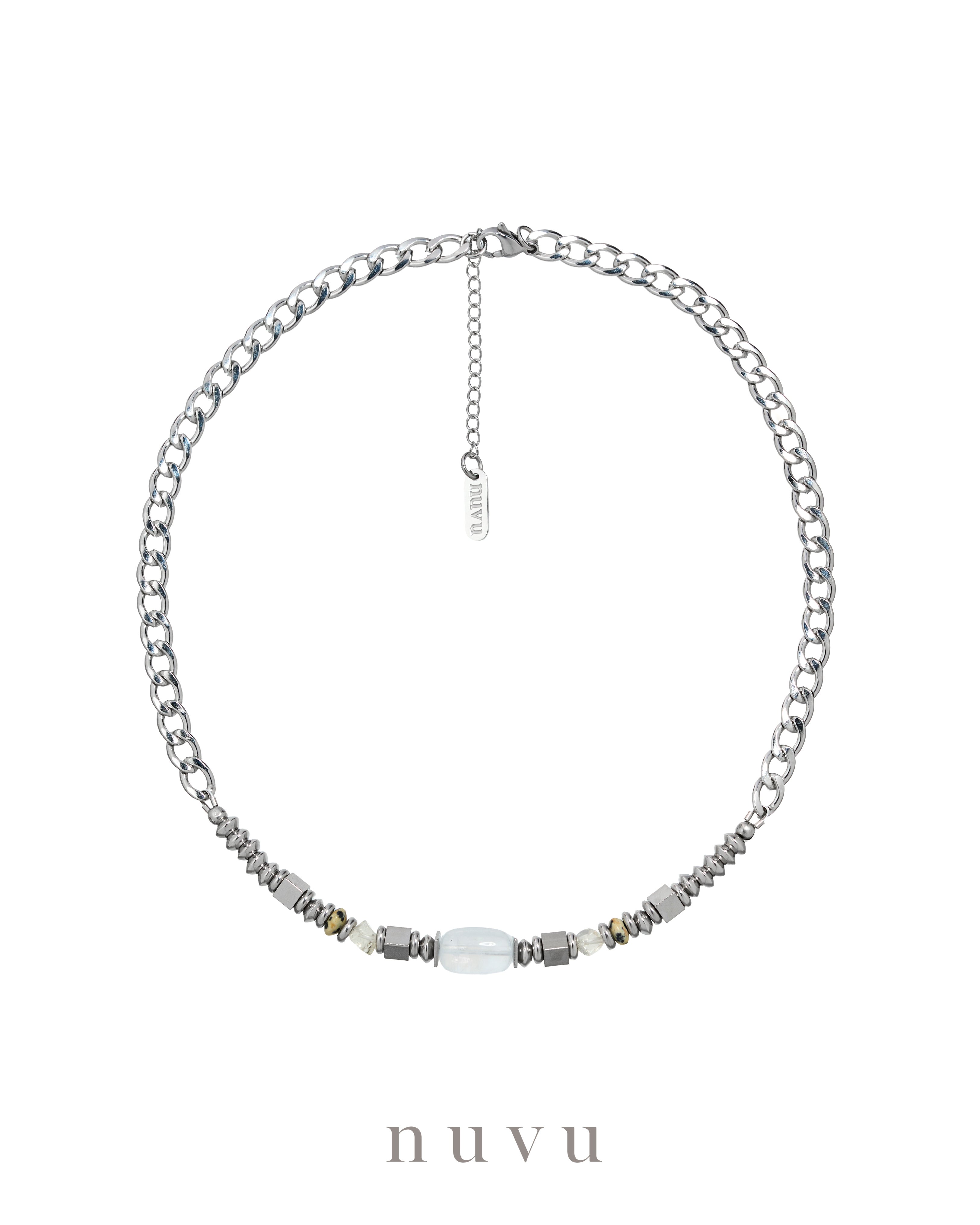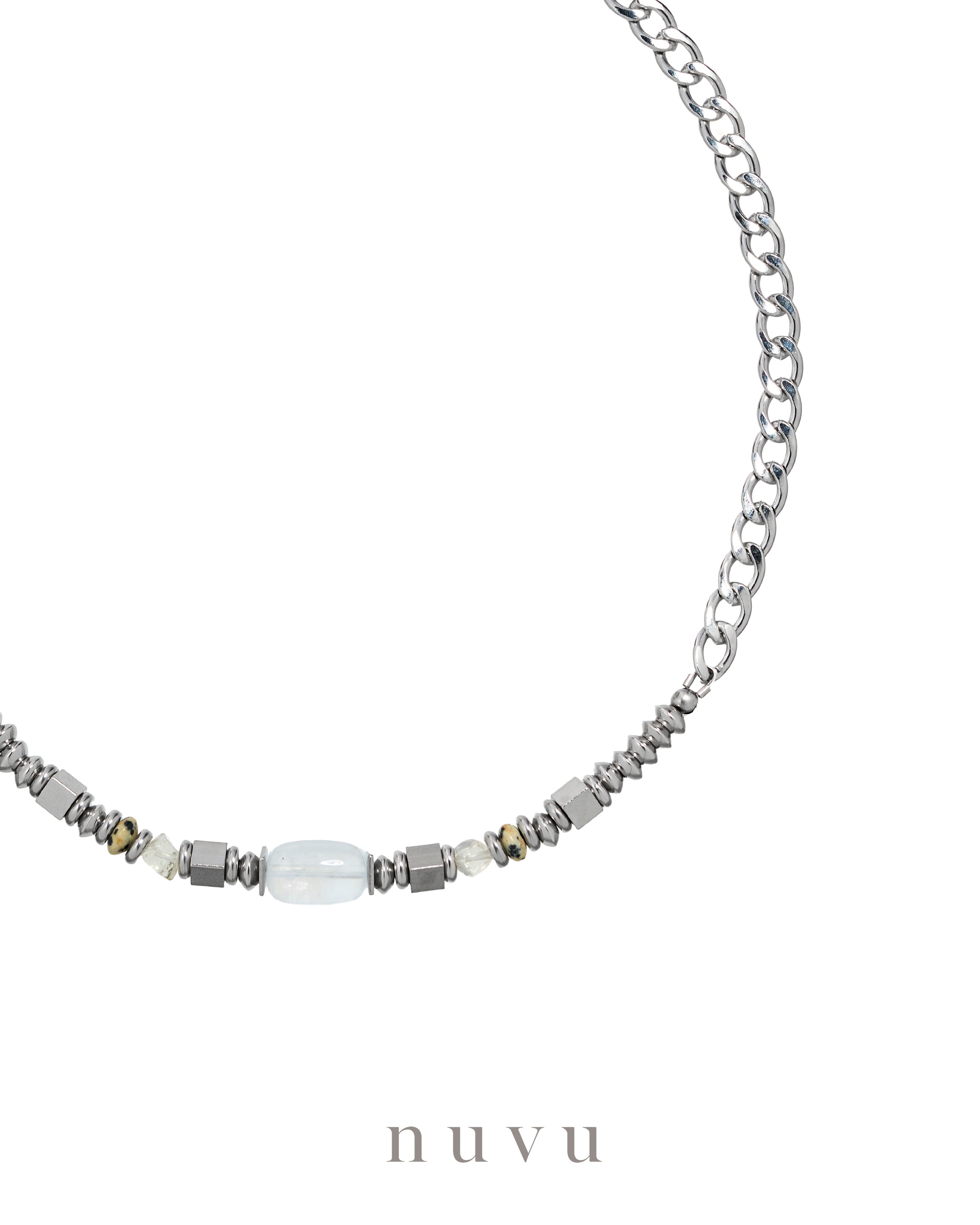 NUVU · Angel Thread Series The rare and ethereal Blue Needle Quartz — known as the “Wings of Angels” — is a true miracle among crystals. Within its clear body, delicate threads of blue light shimmer like celestial weavings, pure and mysterious. It symbolizes divine guidance and protection, a spiritual stone for those seeking clarity, strength, and direction. This time, NUVU introduces the Angel Thread Series, featuring the rare Blue Needle Quartz at its core, paired with wealth-attracting Libyan Desert Glass and playful Dalmatian Jasper. Together, they blend purity with strength, grace with spirit — an elegant reflection of angelic energy: gentle yet powerful. 💎 Blue Needle Quartz — The Light of Angelic Wisdom It helps you clear your thoughts, stabilize emotions, and rediscover direction in times of confusion. By cleansing subconscious blockages, it allows you to express yourself with calm clarity — to speak your truth with softness and strength. It enhances communication and intuition, guiding you to live with authenticity and self-trust. 💫 Libyan Desert Glass × Dalmatian Jasper — Luck and Joy Combined Libyan Desert Glass carries the frequency of prosperity and opportunity, bringing breakthroughs and transformation even in difficult times. Dalmatian Jasper, with its lively, optimistic energy, adds warmth and playfulness — reminding you to move through life with lightness, hope, and joy. The Angel Thread Series helps you stay centered and calm, sharpening focus and restoring emotional clarity. It supports you in releasing anxiety and confusion, so you can face challenges with faith, balance, and inner peace. Crystal : Blue Needle Quartz, Libyan Gold Tecktite , Damatian Jaspers Material : Stainless Steel Bead size : 6-8mm Necklace : 40+5cm Delivery Time : All our designs are meticulously handcrafted, which requires time for production. Kindly allow 7-14 days for delivery to your doorstep. Any special enquiry please contact our customer service.